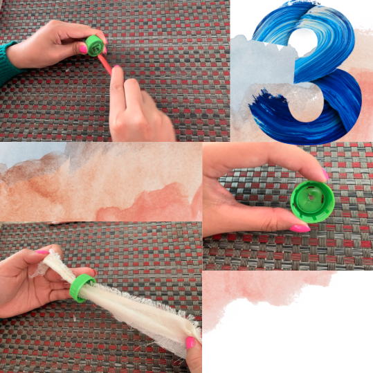 Desenrosca la tapa y con el cúter o exacto le harás un hoyo en medio de la tapa, de tal manera que quepa el pedazo de tela. Pasa el pedazo de tela por el hoyo que hiciste anteriormente.