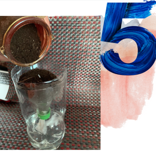 Pon la otra parte de la botella en la parte de arriba, con la tapa hacia abajo (como se muestra en la foto) Coloca ¾ partes tierra en la parte de arriba de la botella.Paso 6: