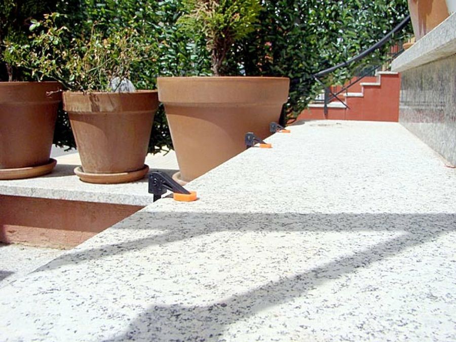 En este tramo del recorrido, Sonata necesitaba llevar el agua al otro lado de la escalera, y lo hizo mediante un truco tan sencillo como funcional: pegó el tubo con silicona por debajo de uno de los escalones de granito, ayudándose de unas pequeñas mordazas.
