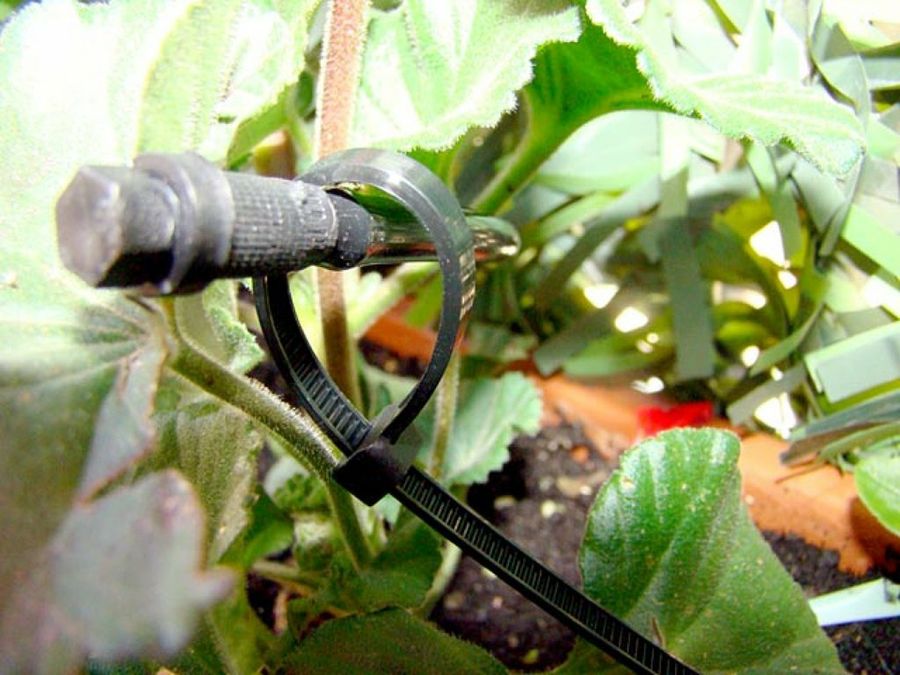 “Para sujetar los goteros utilicé las estacas habituales, hasta que se terminaron. Como no podía salir a comprar unas nuevas, utilicé lo que tenía a mano: unas bridas pequeñas. Pensé que durarían poco, pero ahí siguen, desempeñando su función perfectamente”.