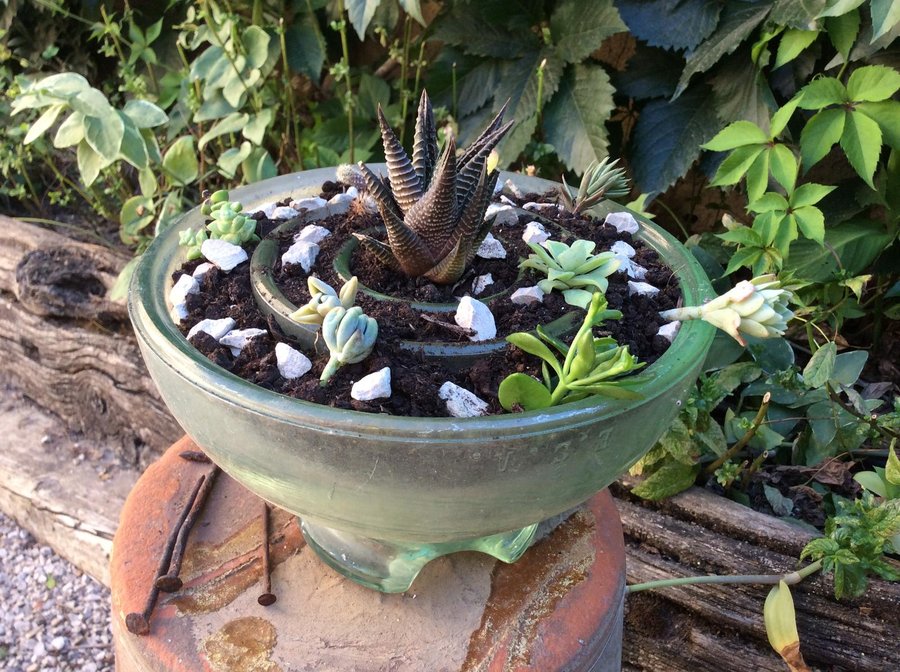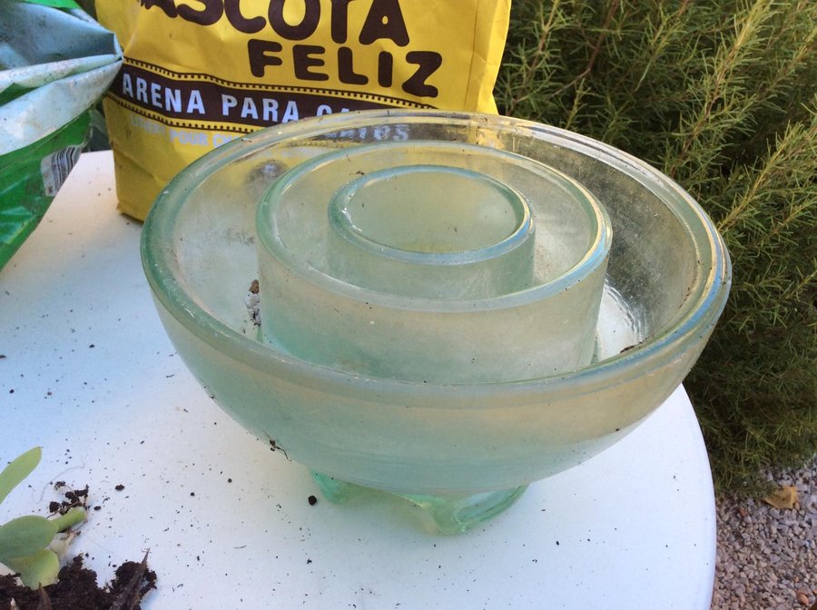 Para este mini jardín he utilizado un viejo aislador de alta tensión que me regalaron, puedes utilizar una pecera, un recipiente de cristal, una vieja olla o sopera, latas...cualquier cosa que tengas sin usar y pueda ser decorativo.