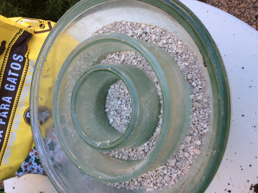 * añadir al fondo dos centímetros de arena de gato, esto nos ayudará a que las raíces no toquen el agua si esta se acumula en el fondo, ya que no tiene agujeros para drenar el agua sobrante.