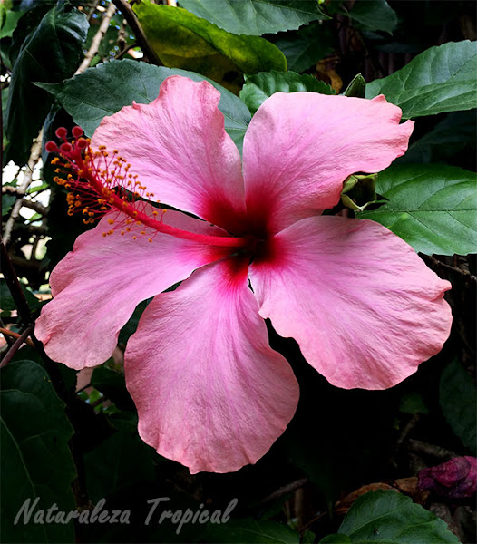 El rasgo más apreciado de los hibiscus son sus largos estambres. La Rosa de China es un buen ejemplo de este particular saliente más allá de la corola.