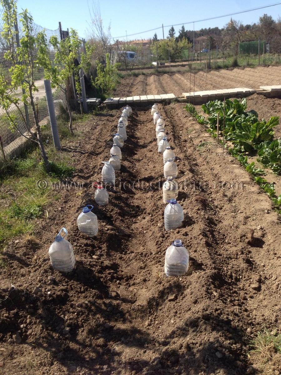 Las protegimos con garrafas de 5 L de agua, pues la temperatura por la noche/ madrugada todavía eran bastante bajas y había rosada por la mañana