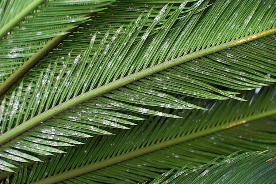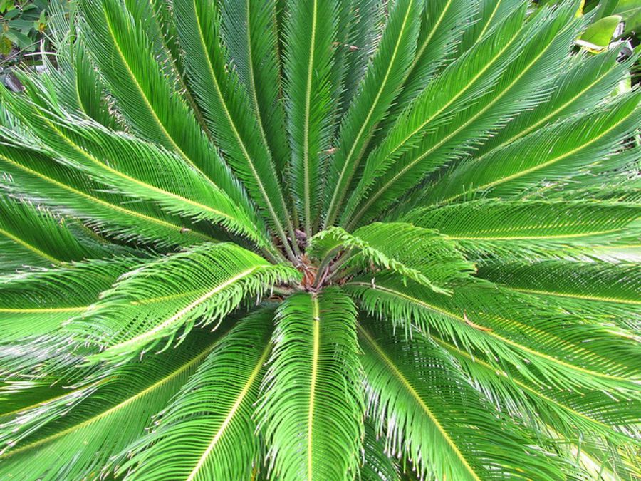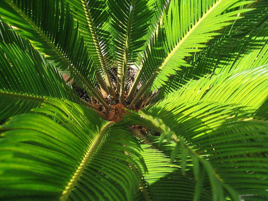 » Hojas de la cica: Alcanzan una longitud de hasta 2 metros y son rígidas, punzantes y de color verde brillante. Se disponen en forma de ramilletes.