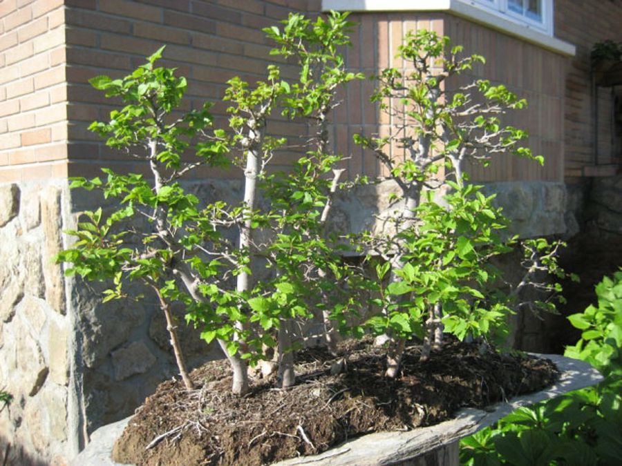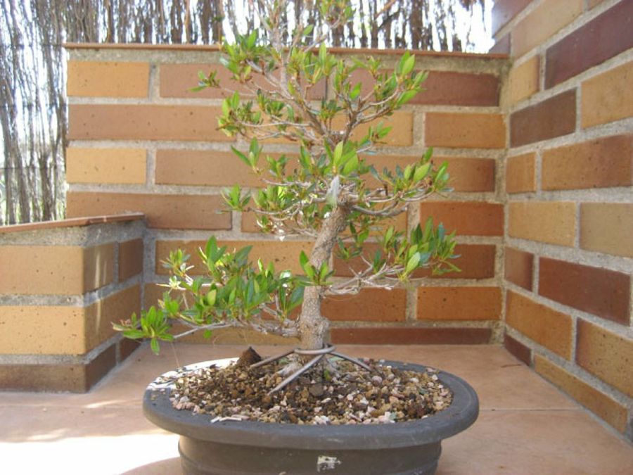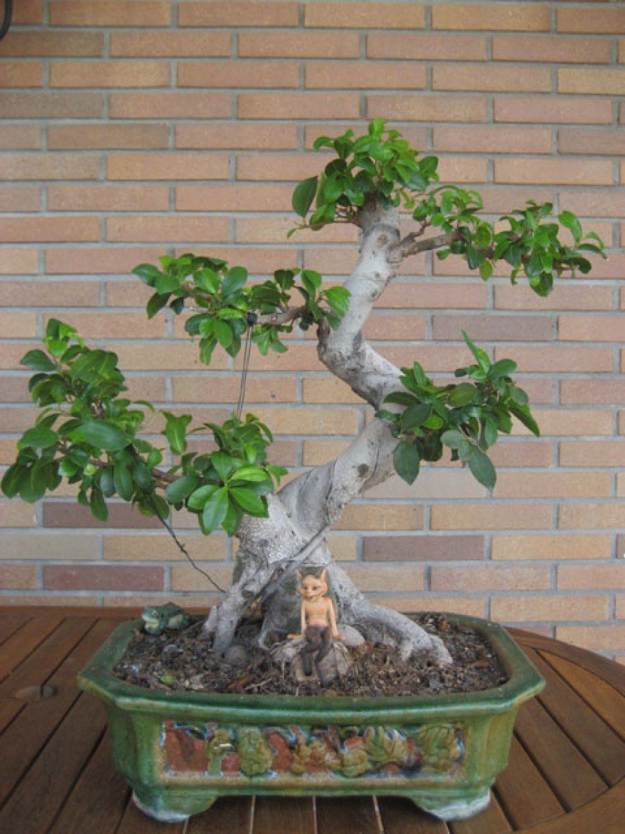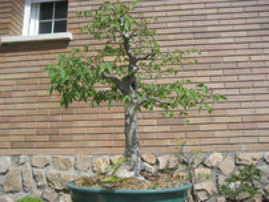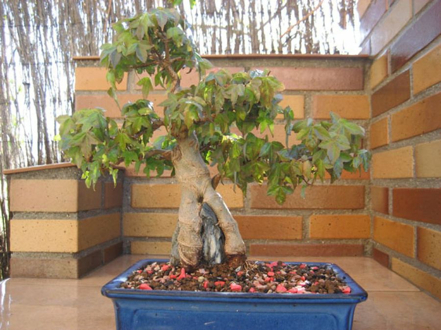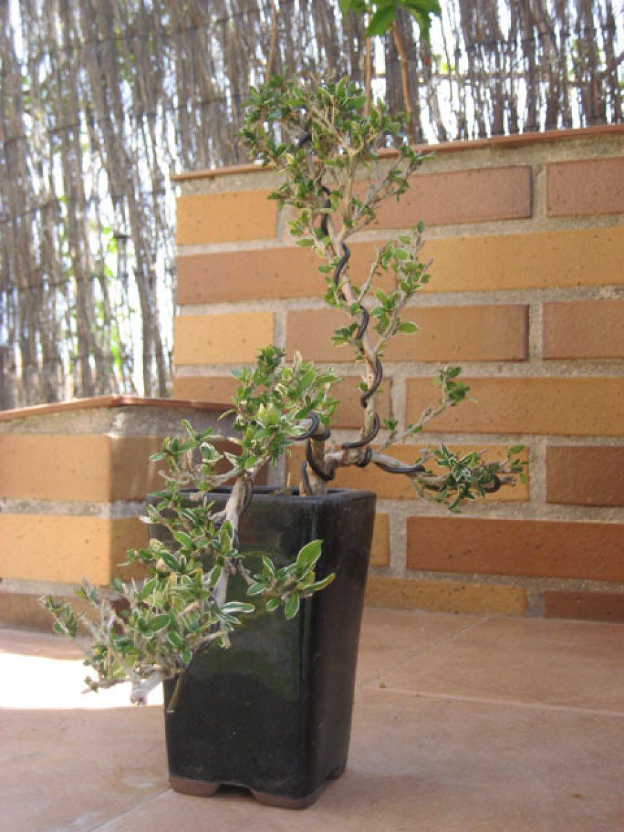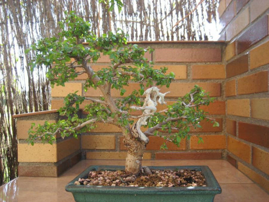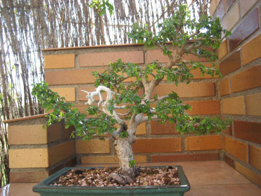 El ficus panda es un bonsáis que se ha adaptado perfectamente a las condiciones del clima madrileño, excepto durante el invierno que debe protegerse de las heladas. Eloísa tiene el suyo a pleno sol y lo riega de forma espaciada, y explica que " si se dejan crecer las ramas, llega a echar unos frutos redondos muy graciosos. Para mantener la forma, hay que pinzarlo en época de crecimiento, bastante a menudo".Este almez o celtis australis es una de las últimas adquisiciones de Boli. Se siente muy orgullosa de él porque se ha adaptado muy bien a las nuevas condiciones del clima y del agua, ya que viene desde Valencia: "normalmente, cuando traigo un árbol, lo tengo protegido durante un tiempo hasta que se habitúa a su nuevo ambiente". En este ejemplar, destaca su nebari, con una buena ramificación.