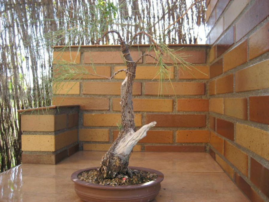 Este ejemplar de tamarix viene directamente desde Valencia, y es uno de los bonsáis más exigentes en cuanto a sus cuidados. En invierno no aguanta las heladas del centro peninsular, y en verano es necesario refugiarlo a la sombra. Aún así, a esta forera le encanta "por su forma llorona y sus flores, un capricho especial". Para mantenerlo sano se debe abonar cada dos semanas en primavera y transplantarlo cada dos años.
