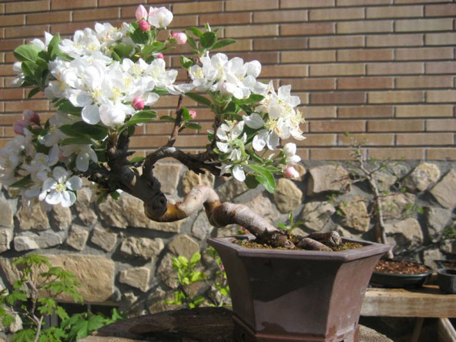 El malus o manzano es otro de los bonsáis que soportan muy bien el particular clima del centro peninsular, con inviernos muy fríos y veranos tórridos. Su rápido crecimiento obliga a Boli a pinzarlo y podarlo con frecuencia. Sus flores, preciosas, pueden llegar a convertirse en manzanas, aunque la forera advierte que "hay que tener cuidado y quitar parte de la fruta; si se dejara en el árbol, éste se podría agotar".