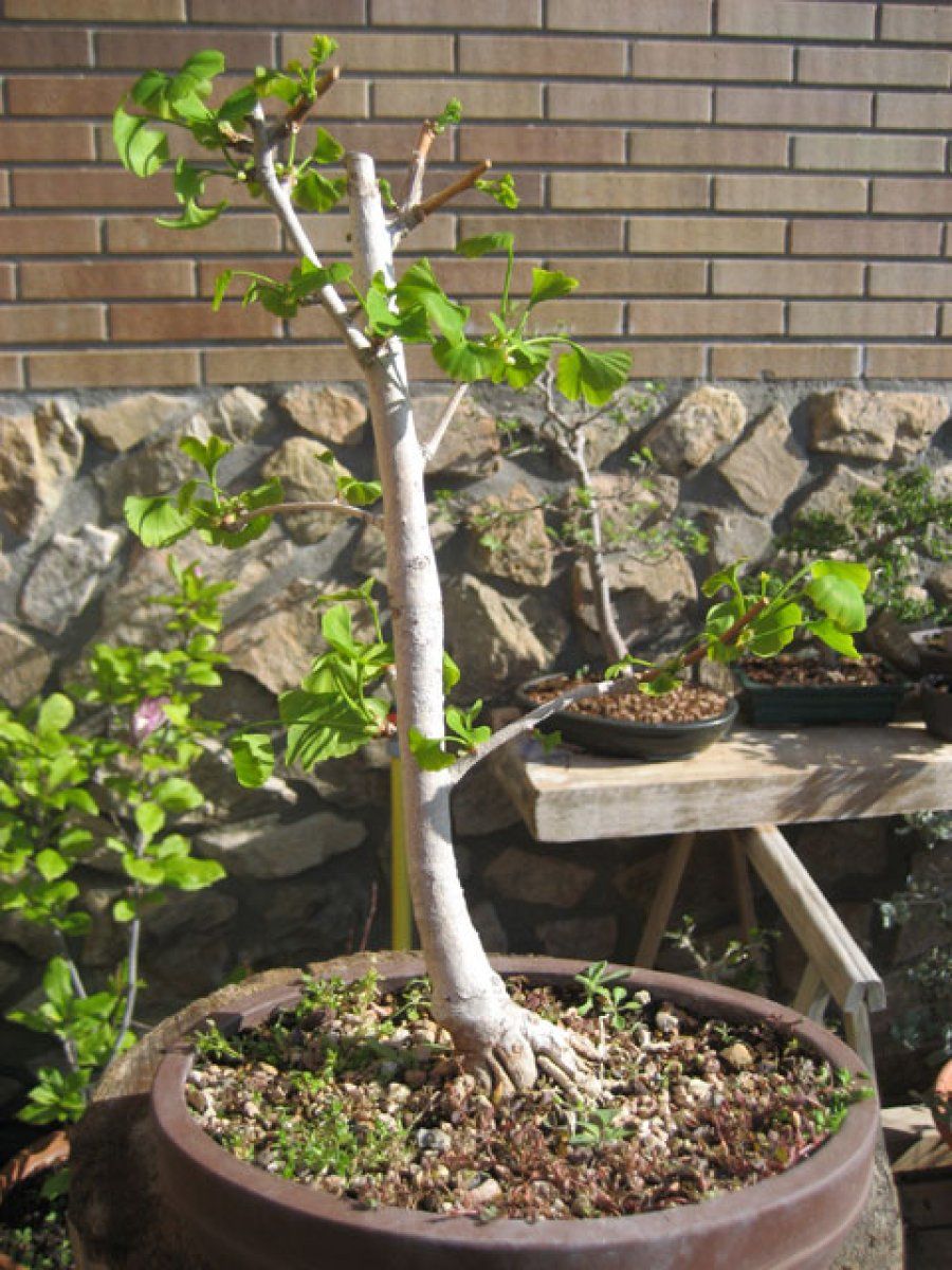 A pesar de su aparente fragilidad, este ejemplar de ginkgo biloba es un bonsái que soporta muy bien la vida en el exterior. No en vano se le conoce con el nombre de ‘árbol de los escudos’, debido a la forma de sus hojas. Se trata de la única especie vegetal que soportó la bomba atómica de Hiroshima. Eloísa tenía un bosque con otros cuatro ejemplares, pero los acabó separando dada su lentitud de crecimiento.