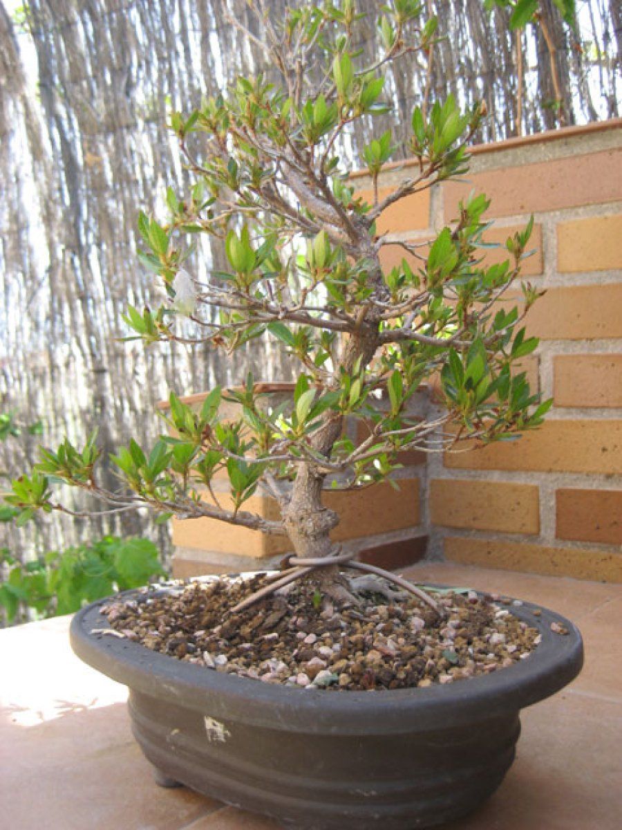 Esta azalea japonica también ocupa un lugar especial en el corazón de Boli, y es que son ya más de tres años los que lleva junto a ella. Durante el invierno pierde casi todas sus hojas, mientras que en verano no soporta bien el sol directo, ya que necesita mucha humedad. Con la llegada de la primavera, se llena completamente de flores, siendo uno de los bonsáis más espectaculares de la casa.