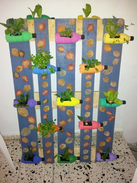 Con un viejo palet que encontró en al calle y partes de otro roto que tenia por casa se construyo un jardín vertical perfecto para ponerlo en nuestro patio.