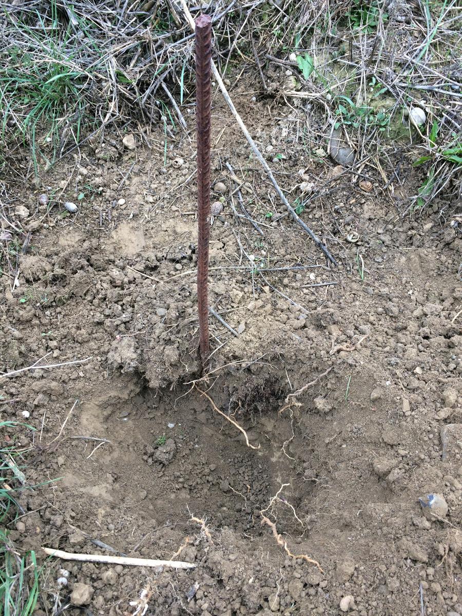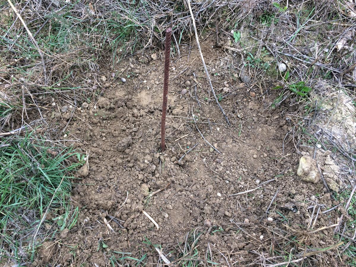 Colocamos con cuidado la vara lo más cerca de la guía que ya estaba clavada, procurando no dañar las pequeñas raíces, y la enterramos con tierra suelta y fina procurando apartar las piedras que pudiera llevar.