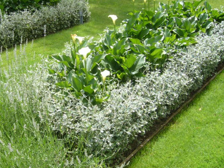 En el parterre, cada primavera florecen las calas, y se consigue un efecto muy ordenado gracias a la bordura de Teucrium fruticans, conocida como salvia amarga. Casi todas las flores de este jardín presentan tonos suaves, no muy llamativos, ya que se busca una sintonía con el resto del paisaje. La organización en parterres permite mayor libertad de juego a los niños.