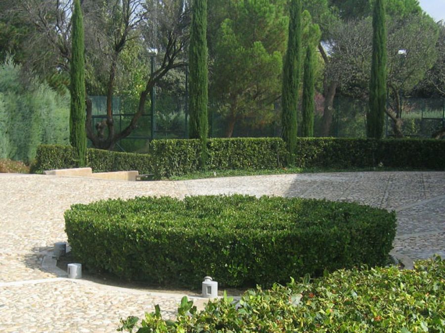 La entrada al jardín está articulada por una rotonda de laurel que organiza el espacio, proporcionando una majestuosa estancia de acceso a la vivienda. La rampa de acceso al garaje queda oculta por setos de laurel, de los que emergen cipreses que dan un ritmo elegante y sutil. La lavanda que bordea el camino nos transmite un aroma típico de las zonas más rurales.
