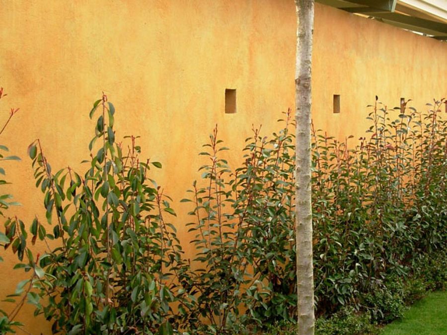 Los muros del pabellón de la piscina están tratados con un acabado óxido que les proporciona un atractivo color anaranjado, en contraste con el verde de la vegetación. Los árboles escogidos pertenecen a la especie Prunus pissardi, conocido como ciruelo rojo, con un llamativo follaje que da color a esta zona del jardín, especialmente cuando florece en primavera.