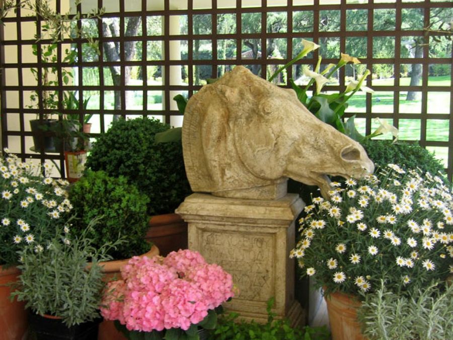 El porche está presidido por una composición de macetas. La combinación de colores suaves en tonos blancos y rosados queda muy bien con verdes intensos. Este juego cromático se consigue con Buxus sempervirens, Lavandula, Callas, Hydrangea y otras especies. El busto del caballo sirve de epicentro a partir del cual se disponen el conjunto de macetas en un orden aparentemente caótico.