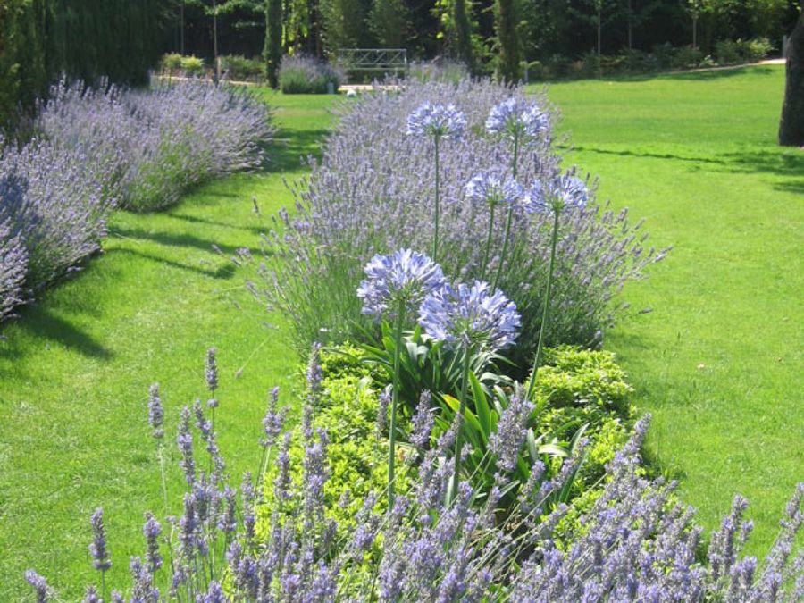 Los parterres de lavanda ordenan y estructuran el vergel, proporcionando una abundante y hermosa floración. Esta planta está perfectamente adaptada a las condiciones bioclimáticas de Madrid, y apenas necesita riegos. La plantación, de Agapantos africanus y Lavandula officinalis, florece todas las primaveras, al tratarse de especies vivaces.