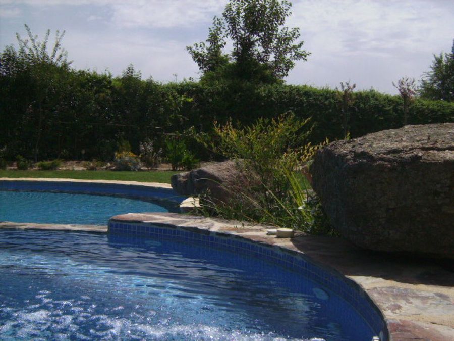 Sin lugar a dudas la piscina ocupa el mayor plano de importancia en este jardín, tanto por su tamaño, como ubicación frente a la vivienda, o su suave y naturalizado diseño.