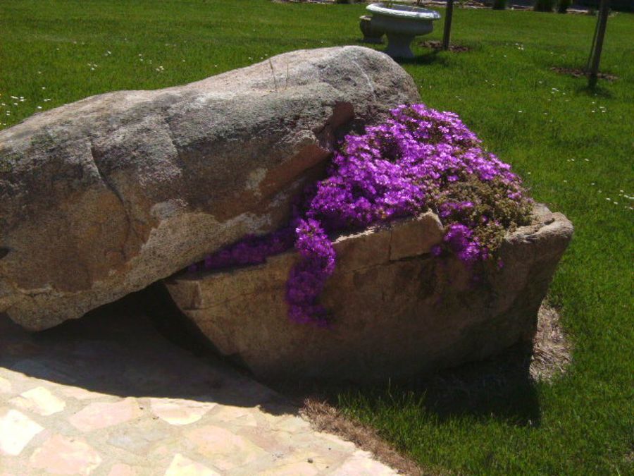 Entre las rocas que salpican la pradera y la piscina, se plantaron entre otras especies de rocalla, Drosanthemum spp.