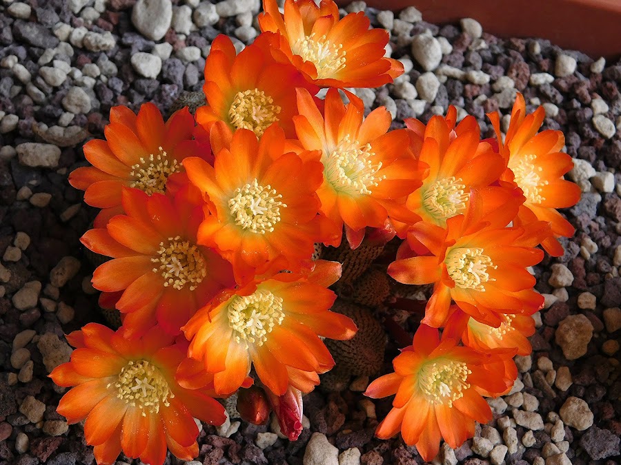 El cactus de flor Rebutiaes muy fácil de cultivar y este empieza a florecer cuando aún es joven y lo hace de manera abundante en primavera-verano. Sus flores son verdaderamente llamativas, de colores intensos y a veces envuelven los tallos que pueden ser cilíndricos o redondos, y estar cubiertos por unos brotes simétricos denominados tubérculos, los cuales están rematados por una aréola pequeña con forma de cojín. Existen diversas variedades para escoger, de flores amarillas, blancas, rosadas, anaranjadas y rosadas.