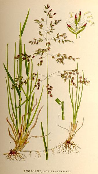 Poa pratensis. Aunque su instalación es lenta y delicada, una vez instalada estolona muy bien, ofreciendo un tapiz compacto. Se usa mucho en céspedes deportivos, por su resistencia. Necesita tª superiores a 20ºC para germinar. Soporta bien la sequía moderada.