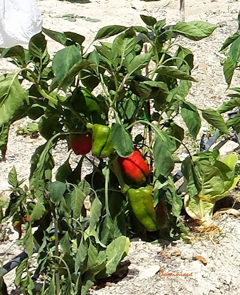 En ora zona los pimientos, aún pequeños y un poco atrasados y algunos ya coloreando.