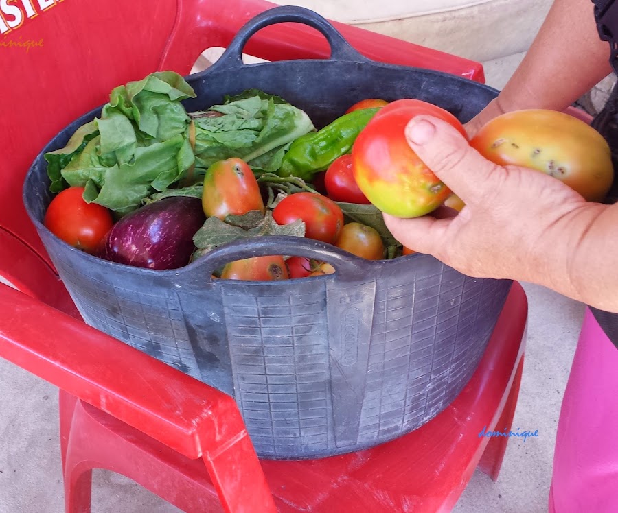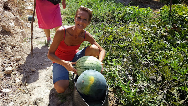 Hay muchos detalles que no pude fotografiar cómo los manzanos, las berenjenas, las pencas, las calabazas pero os aseguro que la cosecha que obtiene es abundante, nuestro trabajo y risas nos costó transportar lo recolectado por esos bancales tan empinados, menos mal que Viviana aunque está delgadita aún conserva fuerzas suficientes cómo para transportar ella sola estas sandías y el resto de los capazos, de no ser así se hubieran quedado allí hasta que llegaran los hijos de Violeta para que se encargaran de dejarlos en el porche para su clasificación y proceso posterior.