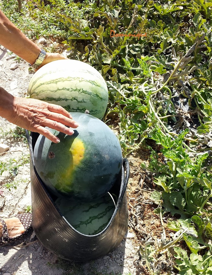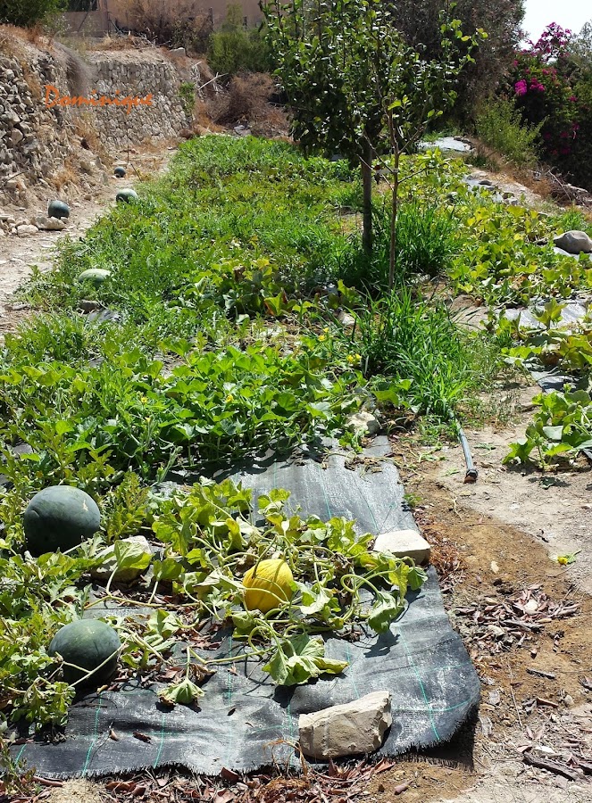 Este año la cosecha no ha sido buena, otros años los tomates salían enormes y los pimientos gordisimos y sanos, a cambió los melones y las sandías están saliendo espectaculares, decía ella, y doy fe, la falta de agua a pesar del goteo, las tremendas temperaturas que hemos soportado no han sido propicias para que cuajaran las flores de las tomateras, los vientos arrasaron muchos de los incipientes frutos y la humedad ambiental demasiado elevada completaron el episodio del fracaso.