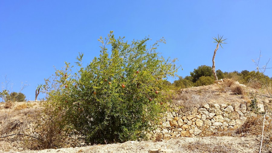 Hacia el otro lado de la ladera hay zonas con viñedos preñados de racimos aún verdes cuyo fruto, la uva de moscatel y otra variedad que desconozco de color morado y granos gordos destinada en su mayor parte para la elaboración de vino, Almendros, granados chumberas y palmeras conforman huellas milenarias naturales del paisaje mediterraneo. Al finalizar el invierno debe ser muy gratificante salir al porche y encontrarse rodeada de almendros en flor, verdes naranjos y cepas renaciendo.