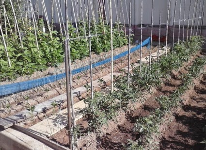 Tomates y judías con sus tutores.