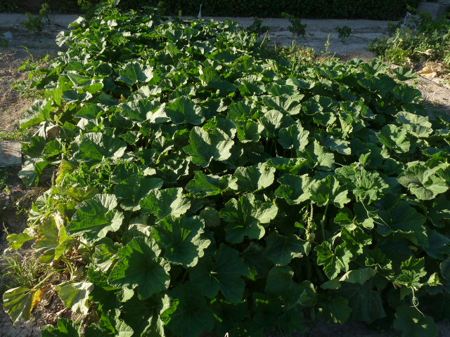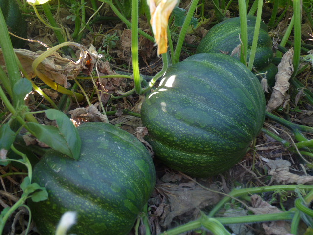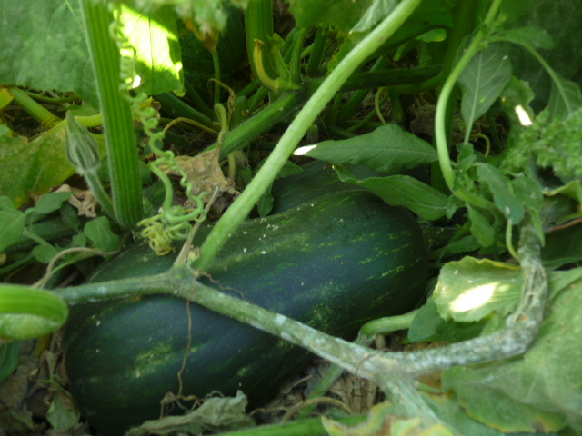 Las calabazas siguen engordando, aunque aún están verdes, a excepción de las potimarron, que las he ido cosechando poco a poco al ser mas pequeñas.