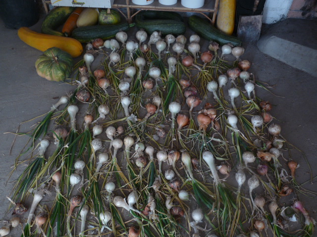La mitad de las cebollas, están secándose para poder guardar, lo del fondo son los calabacines para sacar semilla.