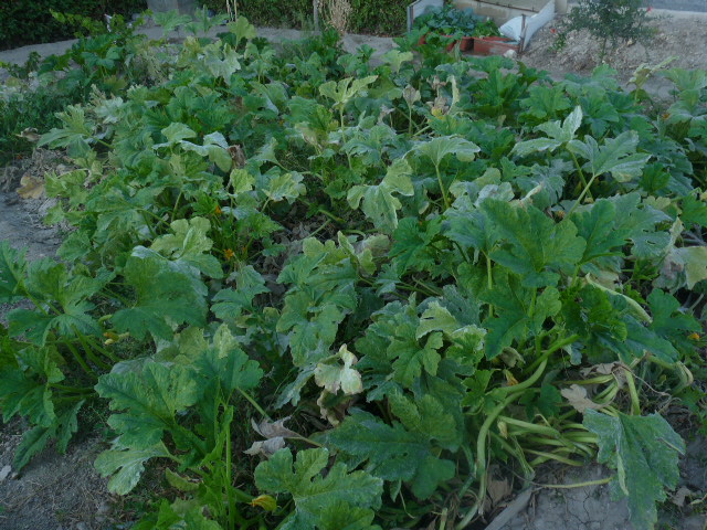 Los calabacines ya se ven bastante maltrechos, pero aún siguen dando flores y algún que otro calabacín, que como crecen rapido les da tiempo a madurar sin problemas hasta que caiga la primera helada, no los quitaré.