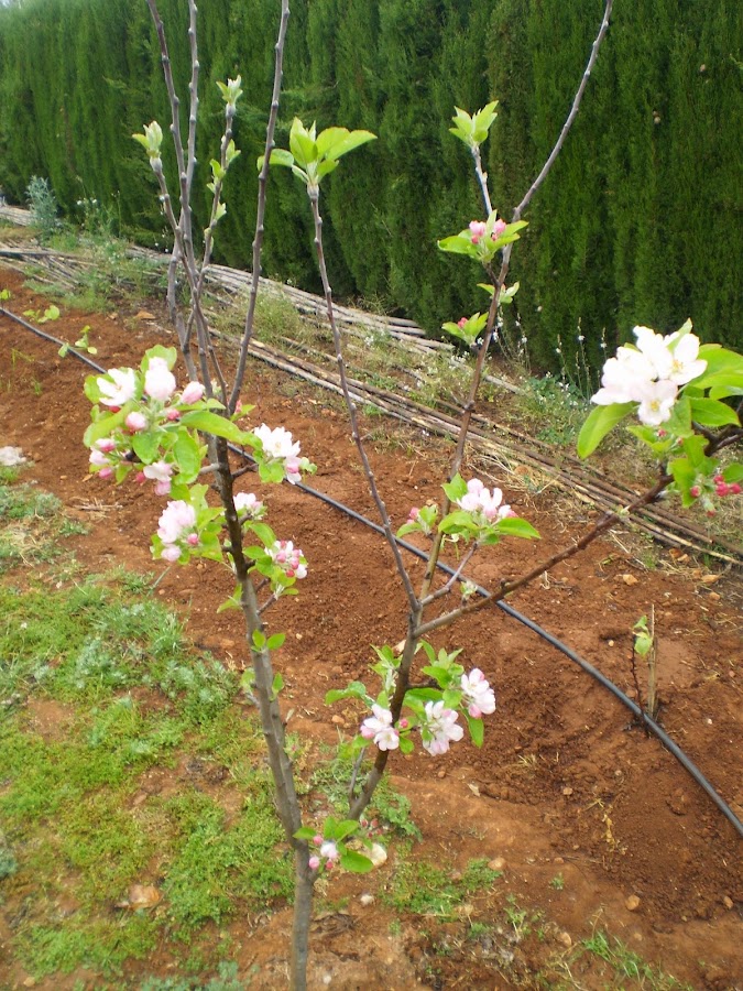 El manzano está floreciendo. Son estupendos los constrastes de los capullos rosáceos con las flores blancas. La temporada pasada pudimos recolectar 2 sabrosas manzanas, veremos que nos depara esta nueva temporada.