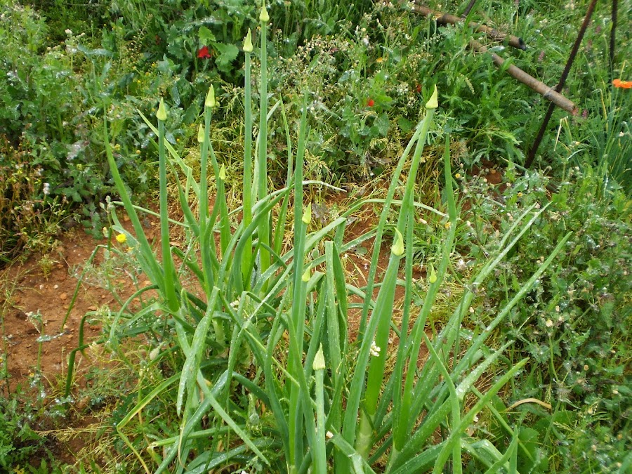 Las cebollas parece que quieren florecer, parece que están ya bastante desarrolladas, tenemos dos opciones, dejar que la flor se desarrolle y obtener semillas para futuras plantaciones o arrancarlas porque el bulbo se puede ir endureciendo y resecando para nutrir a las partes verdes y las flores.