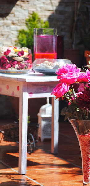 Jarrones con arena de playa, carritos de mimbre para las plantas y un macetero de cuadros azules y blancos. Me gustó mucho el contraste con las flores de color bermellón. Aunque el rojo, el granate el rosa y el fucsia son colores que no faltan en muchos puntos del patio.