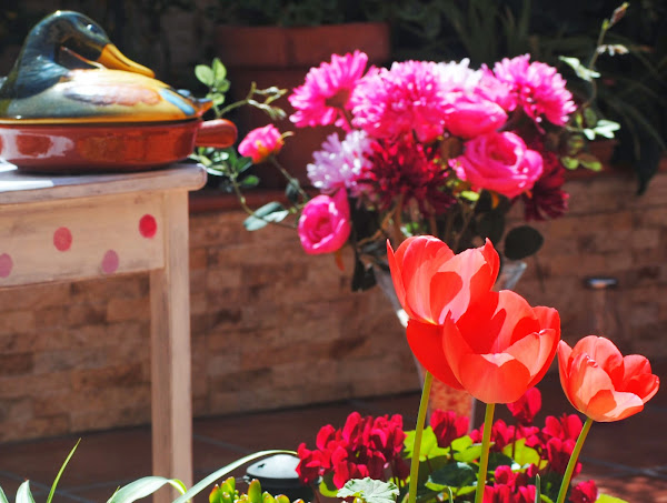 Pili tiene un arriate alrededor de todo el patio lleno de flores que con los primeros rayos de sol de la primavera acaban de florecer.
