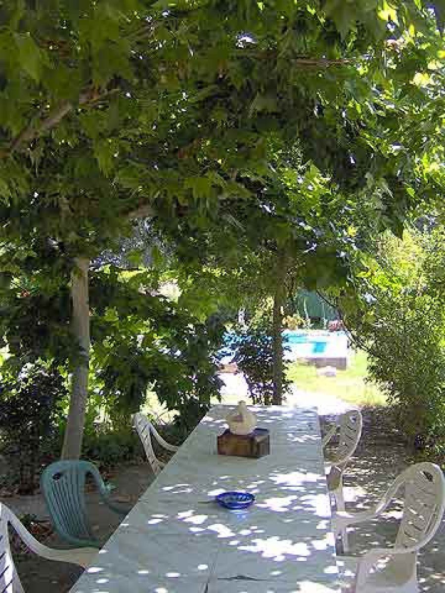 Podemos ver la entrada al cenador, sobreado por plátanos de sombra injertados entre sí, creando un sombráculo perfecto para los tórridos veranos de la meseta. Dentro del cenador, la fresca sombra invita a comer, cenar o bien tomar el aperitivo.