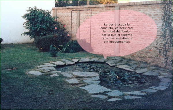 En este caso se hizo una canaleta de 25 cm de alto, 30 cm de ancho y del largo que ocupa el largo del estanque. Allí se colocó la tierra (tierra negra pesada) sobre la que se plantaron las "papas" de las ninfeas (el sistema radicular) y se comenzó a llenar con agua.
