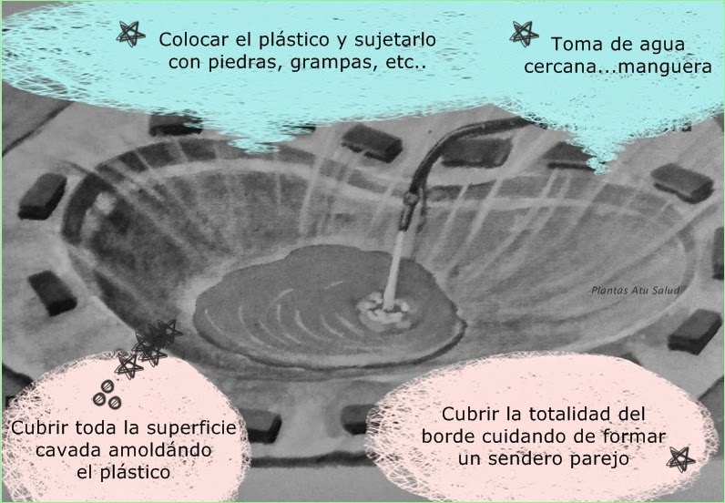 Una vez hecha la excavación, que puede tener un escalón de mediana profundidad en un extremo para otro tipo de ejemplares, se cubre con una lámina de plástico resistente y gruesa de color negro.Se va adaptando al perfil del pozo y sobresale a nivel del piso, siendo cubierta por piedras, lajas u otros materiales a elección. Aquí se aprovecho lajas provenientes de un paso preexistente en el terreno.