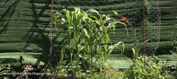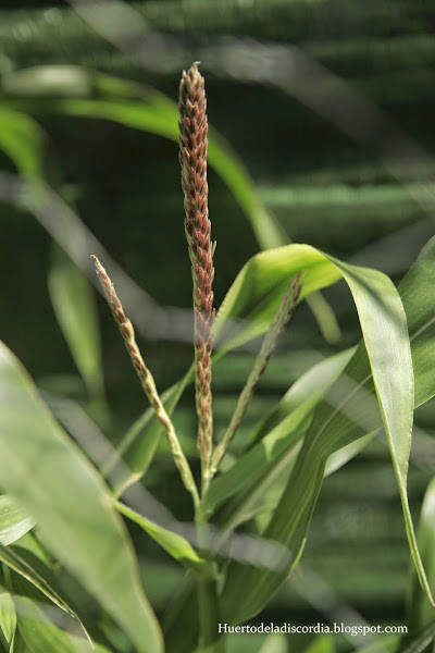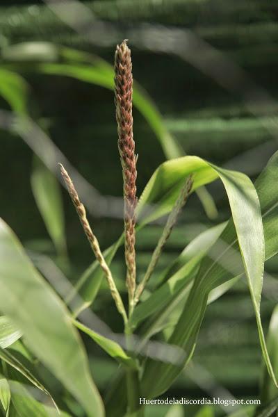 Entonces, una vez salvadas de la polilla del maíz, estaban esperando la época de plantación. No recuerdo exactamente cuando lo hice, pero al final planté la variedad Do país. Tengo anotado que el año pasado los campos cercanos a donde vivo se sembraron a finales de mayo, por lo que supongo que yo habré hecho similar. Mi maíz no está tan grande como los campos que rodean Santiago, quizás porque no es transgénico, quizás porque no le da todo el día el sol o quizás porque haga algo mal, pero estos días ya empieza a florecer. Ahora supongo -ya que es la primera vez que lo planto- solo queda esperar a que la mazorca salga.