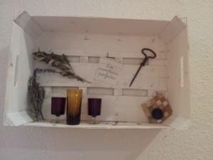 Y seguí con el reciclado de cajas. Descubrí que la gente tira de todo y aproveché 2 cajas que contenían conservas. Las pinté, las decoré y aquí están