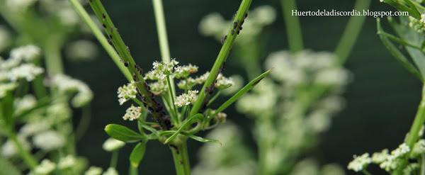 Desde hace ya un mes he empezado a ver en algunas plantas el famoso y odiado pulgón. Ese pequeño bichejo suele ser verde o negro, aunque puede ser de otros colores, y que podemos encontrar en casi todo tipo de plantas. Su preferencia suele ser los brotes más verdes y nuevos, aunque se puede encontrar en muchas partes, eso si, normalmente juntitos, como dándose un banquete a costa de nuestra planta. El pulgón se alimenta de la savia, va chupando el jugo que producen nuestras hortalizas dejándolas muchas veces exhaustas. Además, al alimentarse de ellas, pueden favorecer la entrada de enfermedades que dañarán aún más al sujeto sobre el que se estén alimentando.