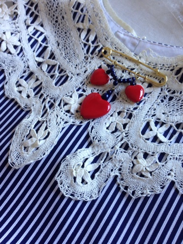 Estamos invitados a la boda. Para la niña he hecho el vestido en el estilo marino q esta muy actual ahora. La tela 100% algodon, encaje q mi bisabuela ha hecho al principio de años 30 del signo pasado (entonces tiene alr. de 85 años!) y el broche de cristal checo del año 1986 (lo me compro mi madre ya hace mucho ))))