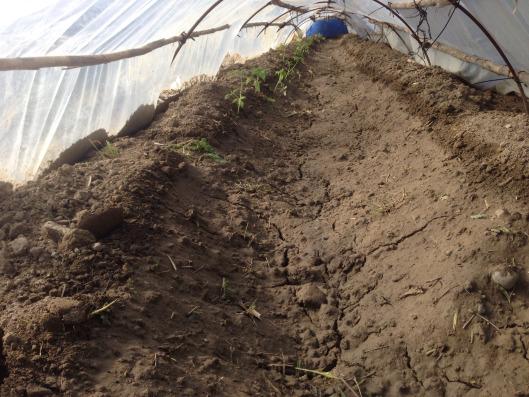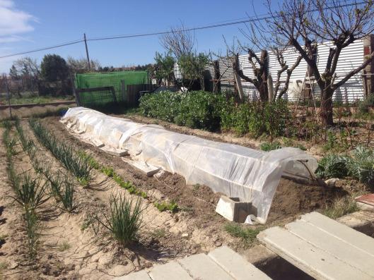 Aprovechamos que estábamos de limpieza en el huerto, hemos quitado el mini invernadero que tapaba borrajas y acelgas y se lo hemos puesto a los tomates.