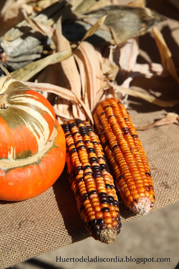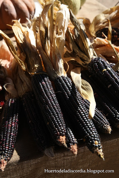 Maíz "Corvo"Por otra parte, entorno a la mesa de intercambio de semillas, se podía encontrar unos puestos en los que se encontraba desde comida, hasta puestos privados de semillas, setas, plantel o productos de la tierra. En estos puestos adquirí la mayor parte de las semillas que me lleve. Aquí me hice con dos mazorcas de maíz de diferentes variedades, presuntamente locales, correspondientes con la variedad Corvo, de color negro y "Do país", con un color rojo-anaranjado claro, con algún que otro grano negro. Ésta última variedad la identificó enseguida mi madre cuando se la enseñé, "es el de toda la vida" me dijo. Además del maíz compré unas semillas de tomate Negro de Santiago y unas judías Manteca de Callosa, estas últimas desconozco su origen, pero las compre porque me las recomendaron por su rusticidad.