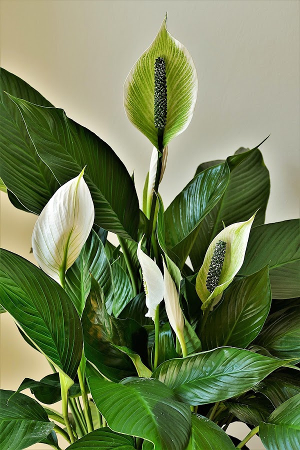 El espatifilo está compuesto de hojas de tamaño mediano que presentan un hermoso verde brillante. Las flores de color blanco en forma de espata surgen del peciolo que se encuentra en cada hoja. La planta se mantiene florecida durante todo el año y resulta ser muy decorativa debido al contraste del color que se produce entre las flores y las hojas.
