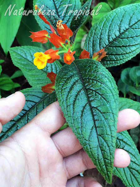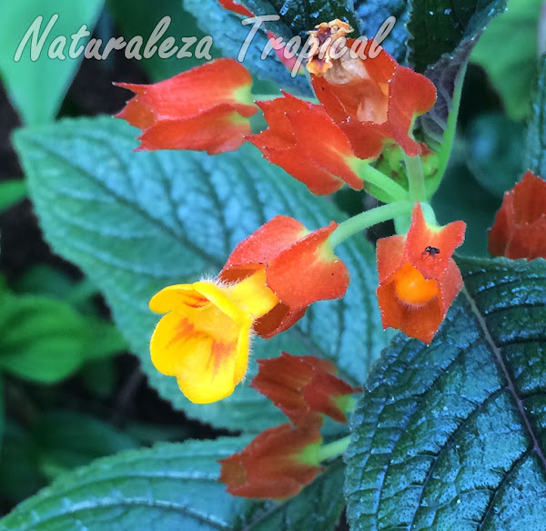 Las flores son pequeñas pero muy atractivas porque la coloración de estas, contrasta muy bien con el color verde metálico del follaje. Estas se disponen en inflorescencias terminales o axilares que desarrollan +/- 5 flores. Las flores se caracterizan por tener el cáliz soldado tubular con 5 costillas de color rojo-naranja y la corola floral (surge del centro del cáliz) acampanada, cubierta de pequeños pelos blanquecinos, con 5 lóbulos abiertos en el ápice, de color amarillo intenso con algunas manchas rojo-anaranjadas en el interior de los lóbulos. La corola floral es efímera llegando a durar +/- 24 horas pero el cáliz puede llegar a mantenerse colorido por más de 3 días. Por esto es probable que observemos mayor cantidad de esta estructura en la inflorescencia que de corolas.