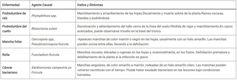 Larvas que perforan y se alimentan del interior de las ramas y el tronco. Causa daño estructural, debilitamiento y, en casos graves, la muerte de la planta. En cuanto a enfermedades, hay un listado amplio: