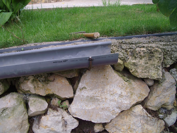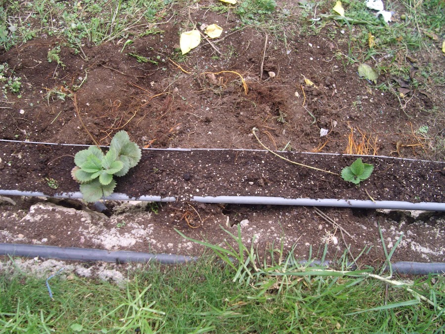 En cuanto al riego, como habréis observado lo de al lado es césped, con el mismo riego del césped riego las fresas, eso sí al canalón se le hicieron unos agujeros para que drenara el agua sobrante.